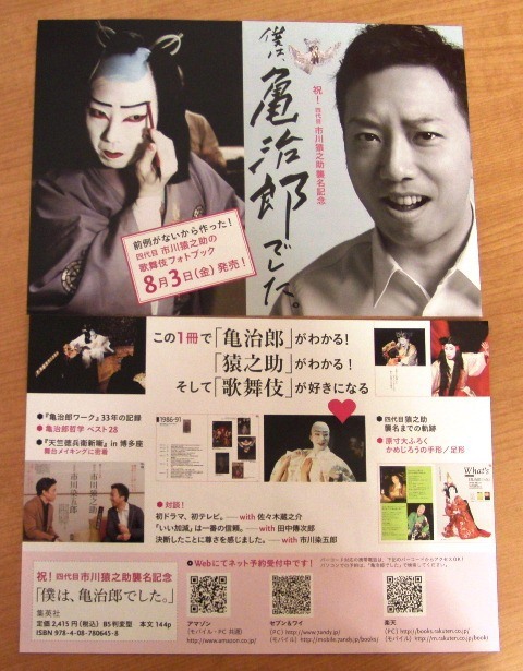 元カメちゃん、猿之助丈の話題ばかりで書き込んで申し訳ありません。新橋演舞場で「僕は、亀治郎でした。」フォトブックのチラシをもらってきました。
