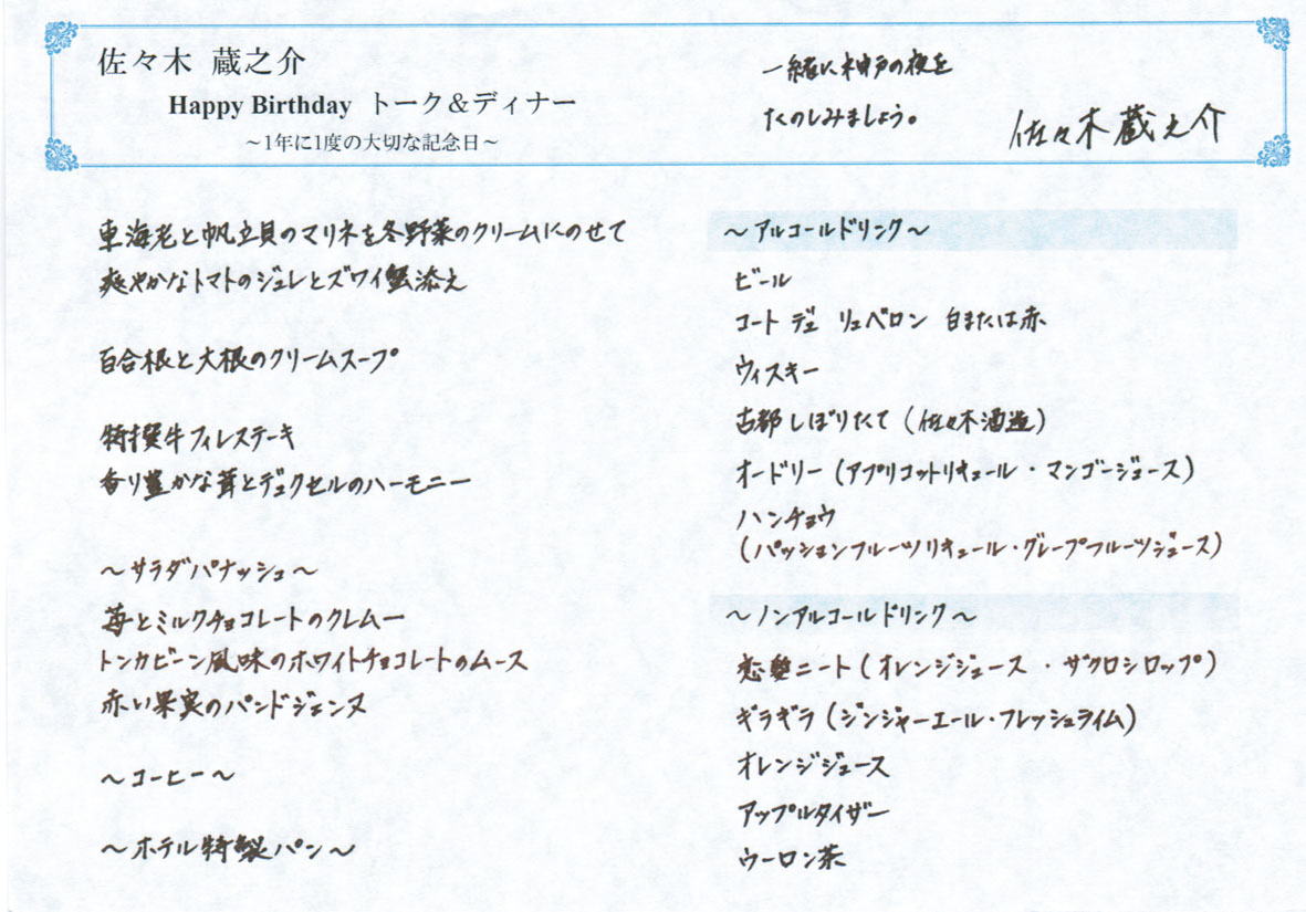 受付をすませるときれいな色のウェルカムドリンクといいますか、食前酒が入口に並んでおりました。オードリー、ハンチョウ、ギラギラ、連来ニートと蔵之介さん出演作にちなんだネーミングのカクテルたち。席に進むと、「一緒に神戸の夜を楽しみましょう」と書き添えられた蔵之介さん手書きのメニューが。蔵之介さんのサービス精神でしょうか。